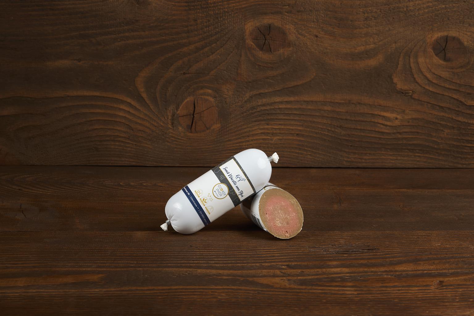 Unsere Snack-Wurst ist schnittfest, das heisst, sie lässt sich problemlos in Stücke schneiden und eignet sich deshalb besonders gut als Gudeli für in die Hundeschule, als Snack für in den Futterbeutel und fürs Training im allgemeinen.