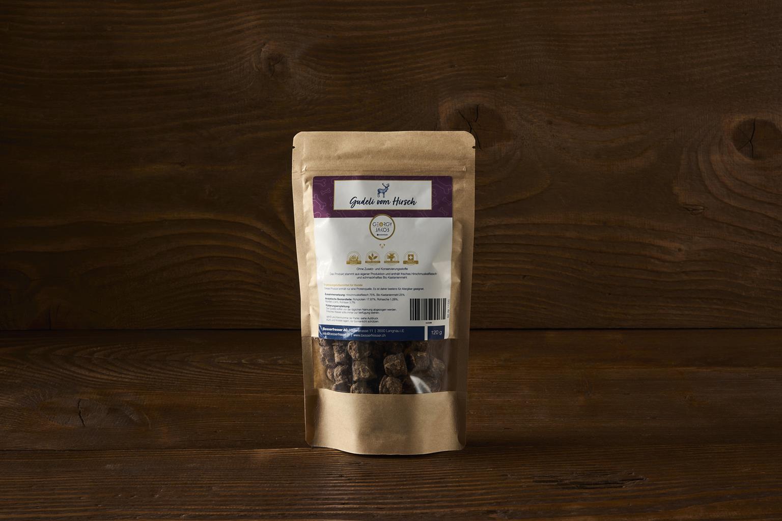Pour nos Gudeli au cerf, nous utilisons de la viande de cerf juteuse et des châtaignes bio riches en nutriments.